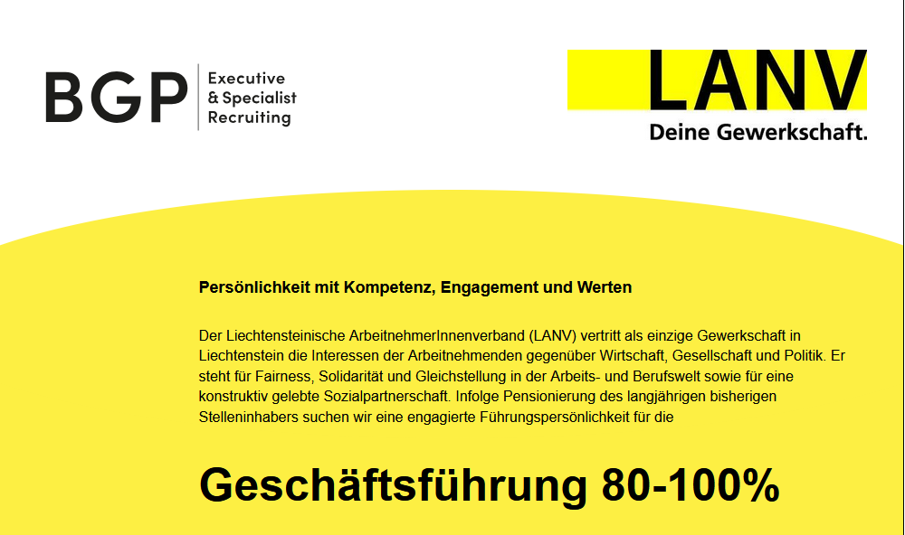Der Liechtensteinische ArbeitnehmerInnenverband (LANV) vertritt als einzige Gewerkschaft in Liechtenstein die Interessen der Arbeitnehmenden gegenüber Wirtschaft, Gesellschaft und Politik. Er steht für Fairness, Solidarität und Gleichstellung in der Arbeits- und Berufswelt sowie für eine konstruktiv gelebte Sozialpartnerschaft. Infolge Pensionierung des langjährigen bisherigen Stelleninhabers suchen wir eine engagierte Führungspersönlichkeit für die Geschäftsführung.